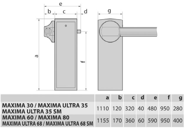 Szlabany serii MAXIMA ULTRA 35 przeznaczone są do wjazdów o szerokości od 3 do 5 m w instalacjach zbiorczych, przemysłowych i na parkingach o bardzo dużym natężeniu ruchu. Kolor jednostki szary (RAL 7015) dostosowany jest do najnowszych trendów urbanistycznych, dzięki czemu nie zakłóca spójności koncepcji projektowych. Szlabany te posiadają silnik zasilany napięciem 230 V, oraz wbudowaną centralę sterującą CSB BR XT wyposażoną w wyświetlacz oraz radioodbiornik na 2048 pilotów. Dzięki zastosowaniu komponentów o najwyższej jakości seria MAXIMA ULTRA cechuje się bardzo wysoką sprawnością i żywotnością (MCBF czyli średni czas pracy bez awarii wynosi do 5 mln cykli). Obudowa przygotowana jest w procesie kataforezy i malowana proszkowo. Wyposażone są w zwolnienia przy otwieraniu i zamykaniu. Bezpieczeństwo zapewnia funkcja wykrywania przeszkód. Szlaban po natrafieniu na przeszkodę natychmiast się zatrzymuje i odwraca ruch. Rozbudowane funkcje centrali sterującej umożliwiają precyzyjne ustawienie położenia ramienia, prędkości pracy oraz innych wymaganych parametrów. W zestawie znajduje się:- Jednostka szlabanu BFT MAXIMA ULTRA 35