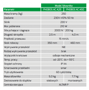 Siłowniki do bram skrzydłowych rezydencjalnych, prze­znaczone do bram o masie skrzydła do 250 kg przy dłu­gości 5,0 m (wersja PHOBOS AC A50). Posiadają silnik zasilany napięciem 230V.